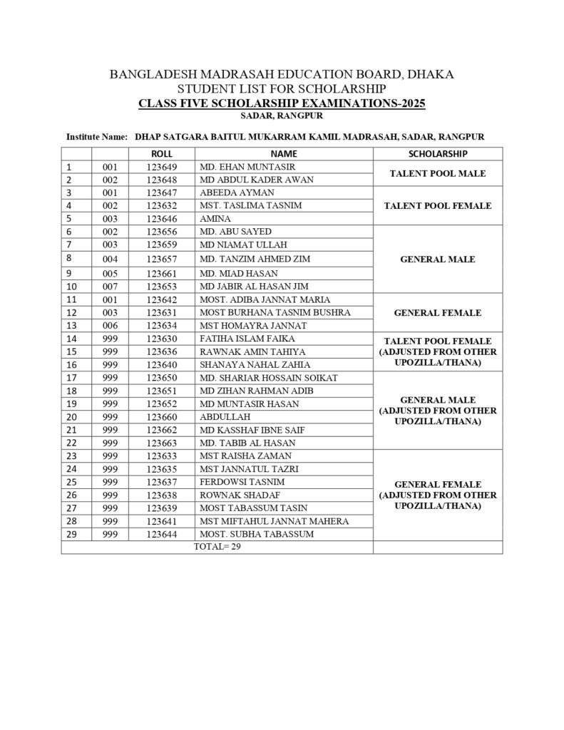 ২০২৫ সালের ৫ম ও ৮ম শ্রেণির সাধারণ ও মেধাবৃত্তি প্রাপ্তদের তালিকা